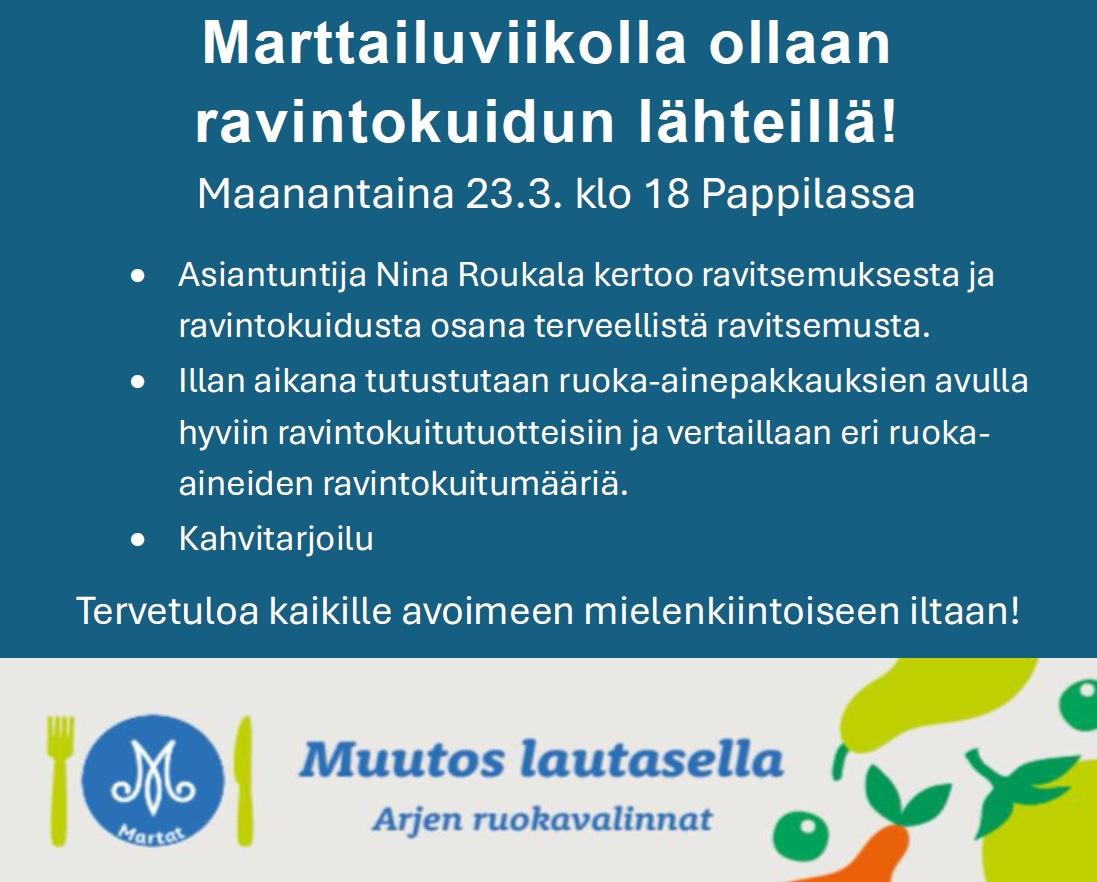 ma 23.3. Marttailta Pappilassa, aiheena ravintokuitu, illassa Nina Roukala kertomassa ravintokuidusta osana terveellistä ravitsemusta. Illassa tutustutaan ja vertaillaan eri ruoka-aineiden ja…